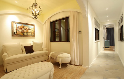 米色在任何时候都体现出一种优雅和高贵,静静地,但是却有魅力无比。一整墙米色壁纸,小小的不规则花纹,让整个空间静谧而优雅,搭配充满设计感的古典皮质沙发椅,宛如身处欧洲的贵族宫殿的某一个空间。